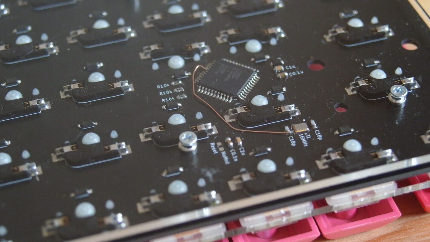 使用者が液タブ使いなので、間に挟んで使えるよう分割に。日本語配列が希望とのことだったので、自作キットだとほぼこの一択となりました。結果これを選んで良かったのですが、ひとつ理想を言いえばコネクタ周りはUSB-Cが嬉しかったです。また、ぼくの不器用さゆえに、チップの表面実装に2回失敗しています。実装済みのものを買うほうが良いかも。