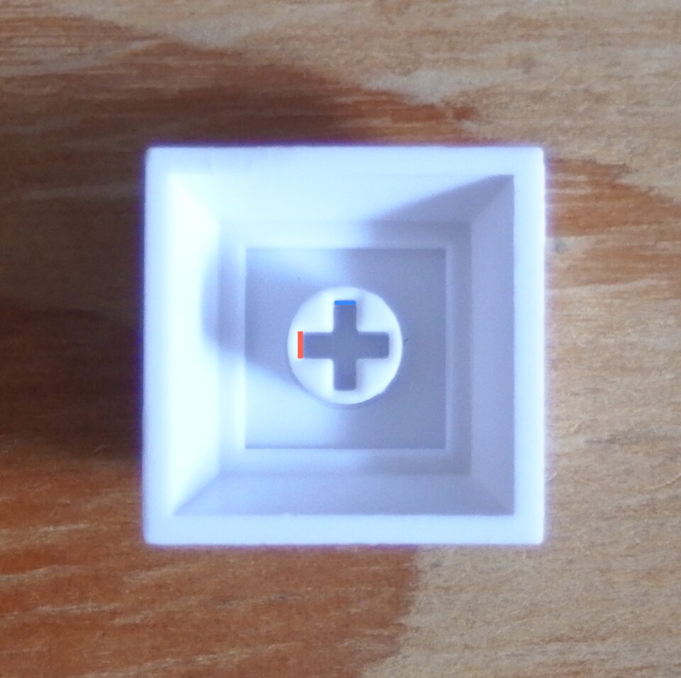 刻印するまえに注意するのが、キーの向きです。MX互換キーキャップの裏側はこんな形状になっているのですが、十字の溝の幅が広い方が水平な場合が多いようです。基盤にも依るので、キーボード上の実際の位置に嵌めながらダブルチェックします。ちなみに、ぼくはいくつか横倒しで刻印してしまいました。