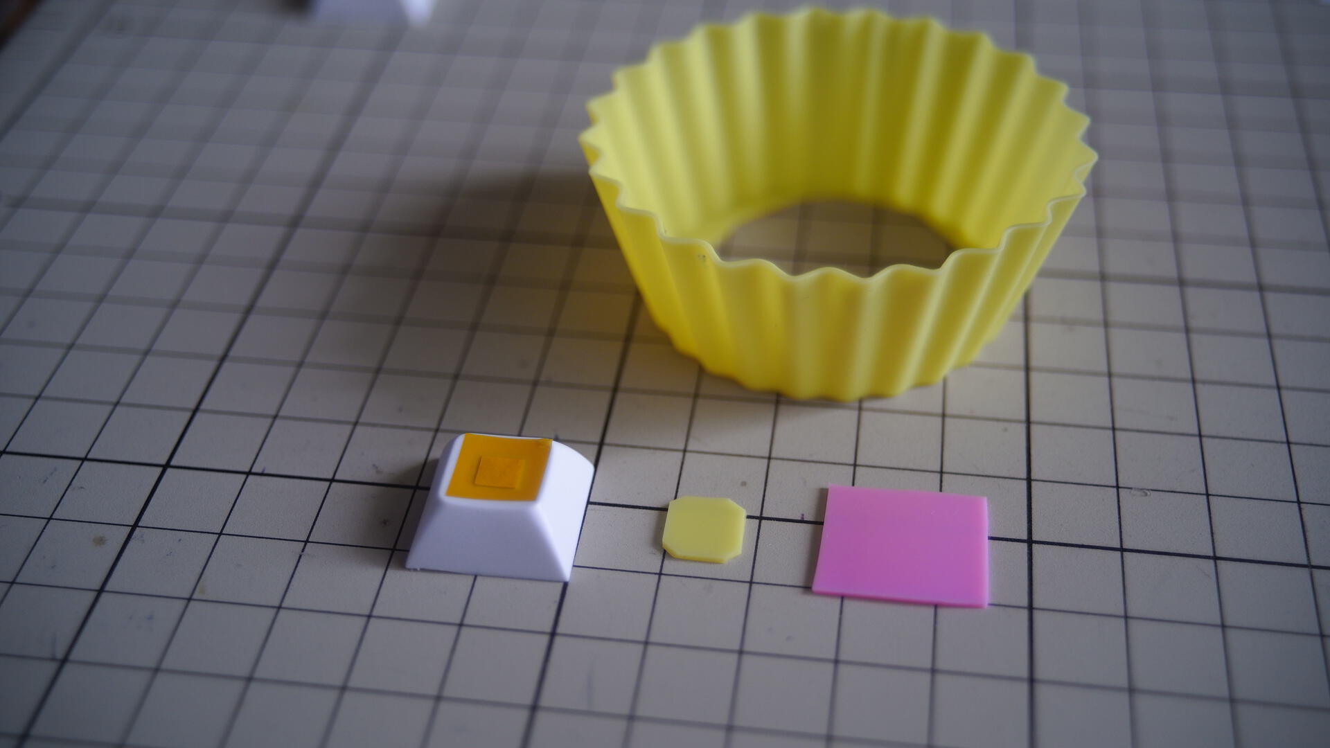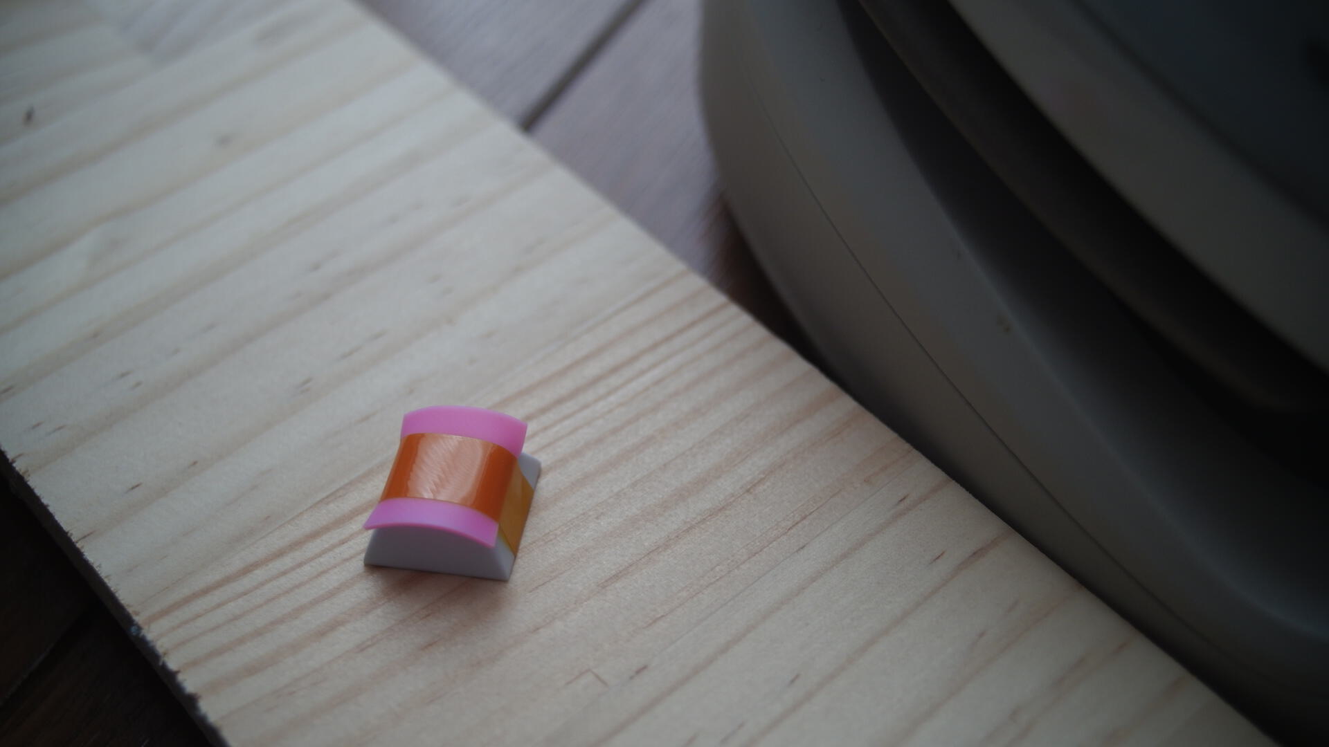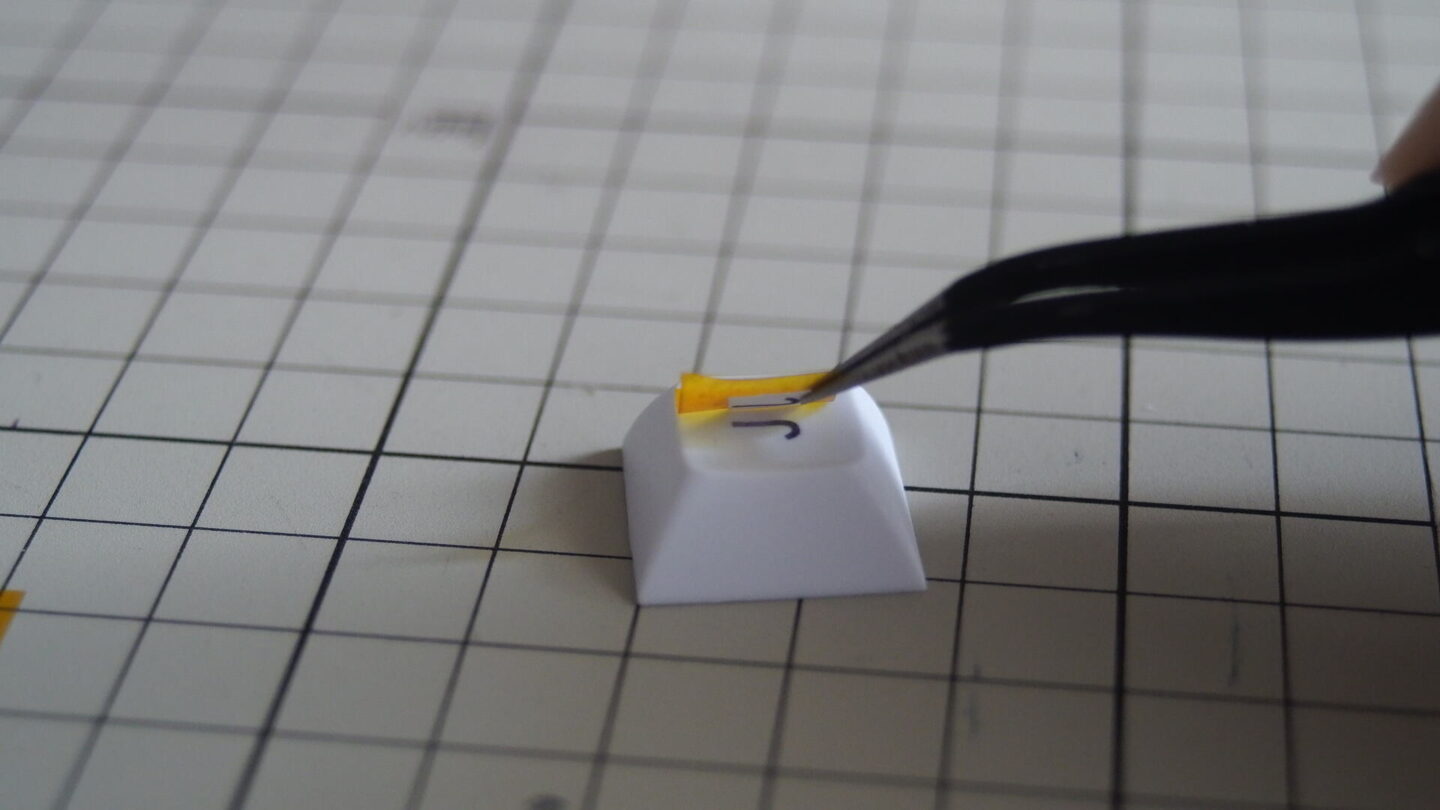 100均のシリコンゴムをつかって「お寿司の卵焼き」をつくります。一点、用紙をカプトンテープでキャップに固定すると、アイロンを当てたときにズレる心配が無くておすすめです。文字の中心を取るのがとにかく難しかったのですが、ある程度はよしとすることにしました。平らなキーキャップであれば、文字のキワキワではなく、キャップ上面の輪郭に合わせてカットするのが吉かもしれません。