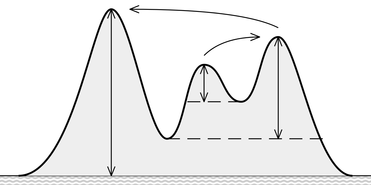 ある島の3つの頂上のプロミネンス。破線が「その頂上よりも高いピークを含まない最も低い等高線」(key col)で、そこから頂上までの高さ(垂直の矢印)がプロミネンスとなる。上の矢印は、「その頂上よりも高いピーク」(parent peak)を表す。